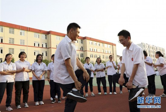 6月2日,在山东省滨州市博兴县第三中学,高三学生在操场上做游戏放松心情。