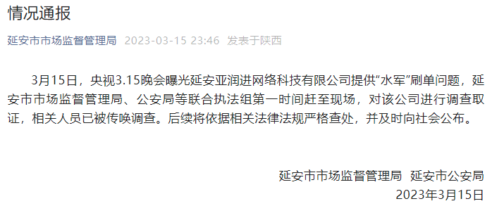 最新进展 : 陕西亚润进网络科技有限公司是被曝光的公司之一。3月15日晚,陕西延安市场监督管理局发布情况通报,市监局工作人员已经前往亚润进网络科技有限公司地址处进行调查取证,相关人员已被传唤调查。