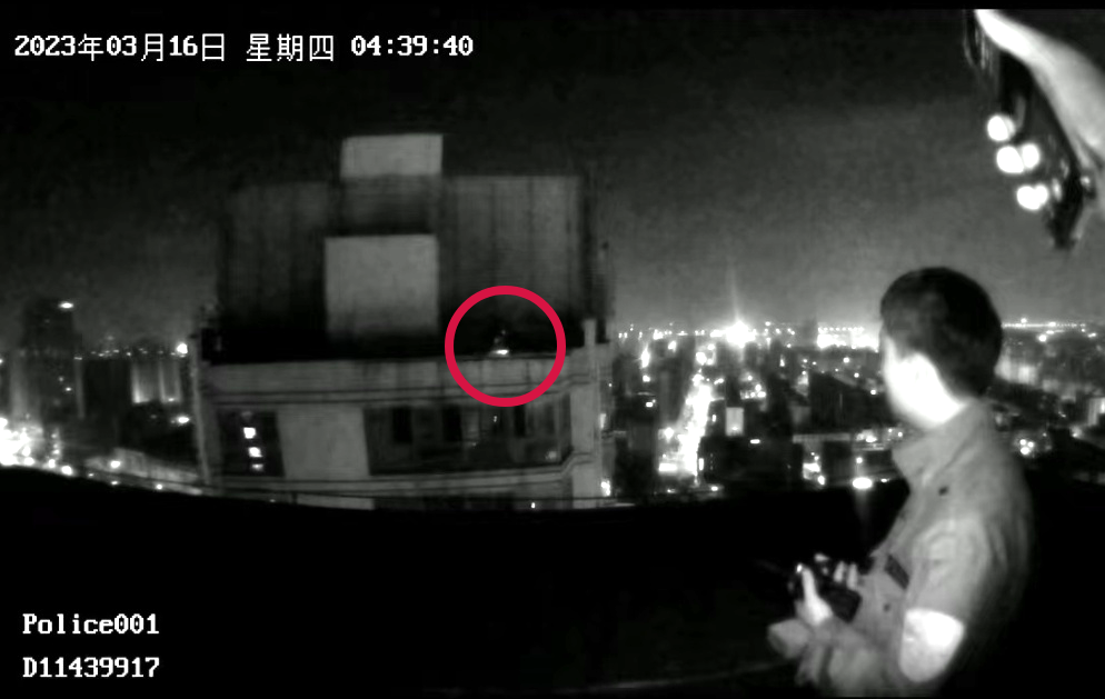 登上天台的民警发现,女子周围没有栏杆,只有几根铁丝,而且她十分警惕,位置离边缘仅半步之遥。特警队员卢鸿宇快速背上安全绳,在女子视野盲区等待机会实施救援。