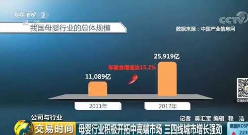 根据中国产业信息网的数据,我国母婴行业的总体规模从2011年的11,089亿元人民币上升到了2017年的25,919亿元人民币,年复合增速达到了15.2%。
