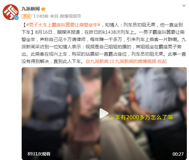 8月16日,据媒体报道,在昨日的k1438次列车上。一男子霸座叫嚣要让乘警坐牢,声称自己花十万请律师,每年赚一千多万,引来列车上乘客一片群嘲。九派新闻采访到一位知情人表示:视频是自己姐姐拍摄的,其姐姐坐在霸座男子旁边。此乘客在绍兴上车,购买的站票却一直霸占座位,列车员劝阻无果。此事一直没有得到解决,直到此人下车。