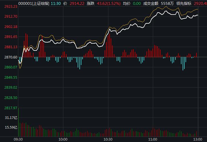 截至早盘收盘,沪指收报2914.22点,涨1.52%,成交额1255亿。深成指收报9107.20点,涨2.14%,成交额1724亿。创业板指收报1499.26点,涨2.04%,成交额524亿。