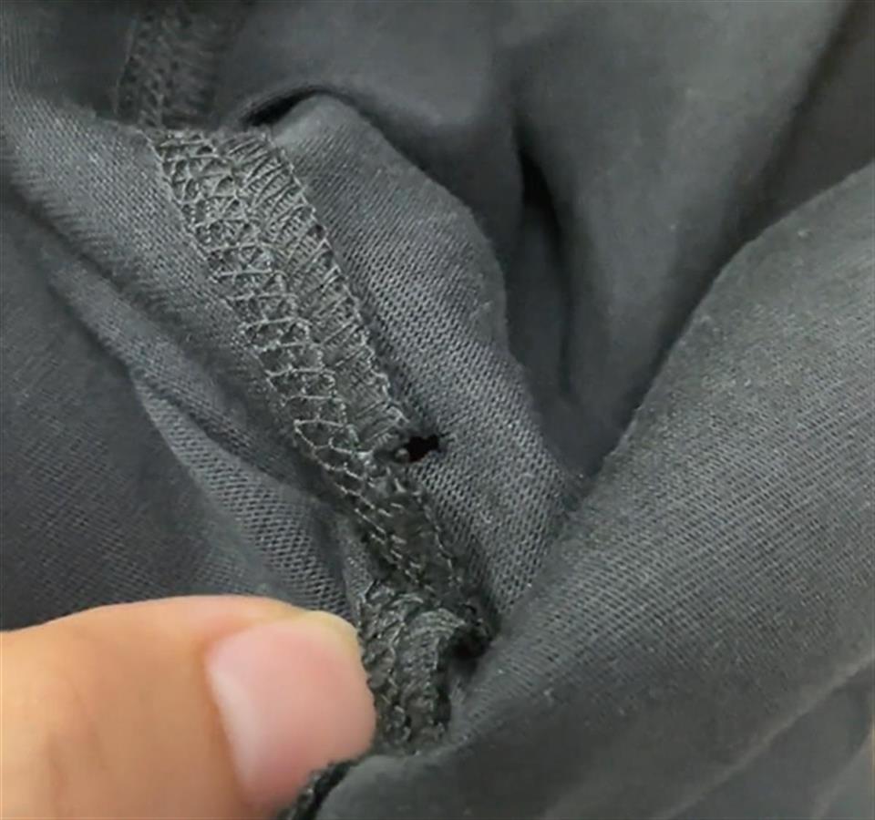 俞先生说,他仔细一看,T恤的肩膀接缝处的确有一个黄豆大小的洞,但他对店员的说法表示怀疑:“衣服又不是玻璃,它是有韧性的东西,而且领口处加上锁边一共有三层,从1米多高的地方掉到地上,怎么可能被砸出洞?”