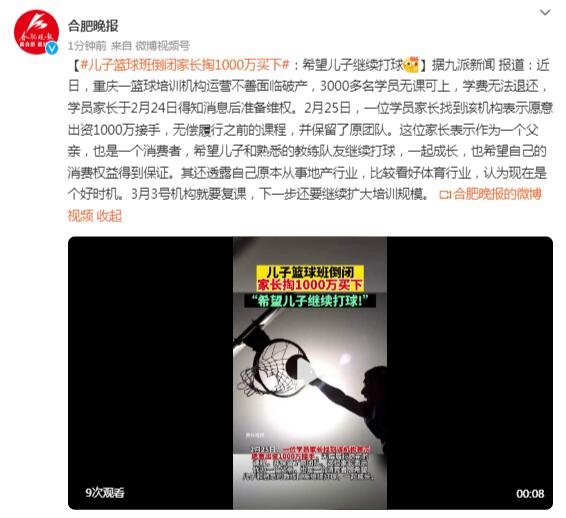 近日,重庆一篮球培训机构运营不善面临破产,3000多名学员无课可上,学费无法退还,学员家长于2月24日得知消息后准备维权。2月25日,一位学员家长找到该机构表示愿意出资1000万接手,无偿履行之前的课程,并保留了原团队。这位家长表示作为一个父亲,也是一个消费者,希望儿子和熟悉的教练队友继续打球,一起成长,也希望自己的消费权益得到保证。其还透露自己原本从事地产行业,比较看好体育行业,认为现在是个好时机。3月3号机构就要复课,下一步还要继续扩大培训规模。