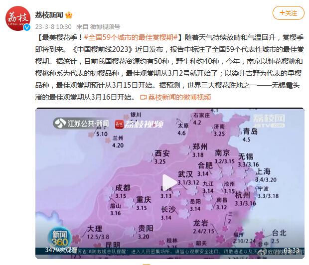 随着天气持续放晴和气温回升,赏樱季即将到来。《中国樱前线2023》近日发布,报告中标注了全国59个代表性城市的最佳赏樱期。据统计,目前我国樱花资源约有50种,野生种约40种,今年,南京以钟花樱桃和樱桃种系为代表的初樱品种,最佳观赏期从3月2号就开始了;以染井吉野为代表的早樱品种,最佳观赏期预计从3月15日开始。据预测,世界三大樱花胜地之一——无锡鼋头渚的最佳观赏期从3月16日开始。