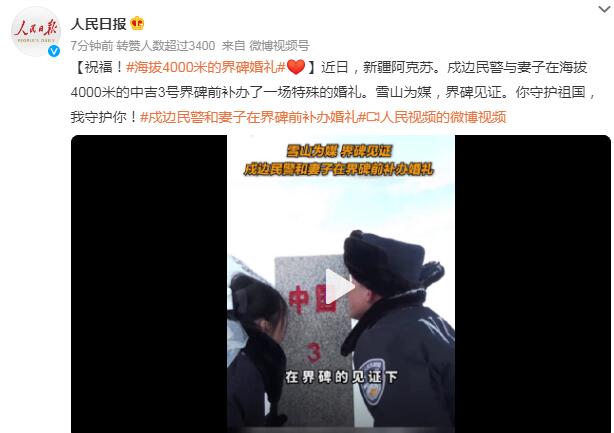 近日,新疆阿克苏。戍边民警与妻子在海拔4000米的中吉3号界碑前补办了一场特殊的婚礼。雪山为媒,界碑见证。你守护祖国,我守护你!