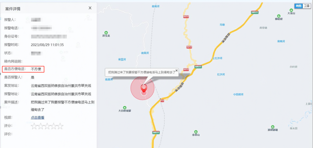 8月29日11点,永州市公安局情报指挥中心接收到一群众微信图文报警、静音报警,提示报警人即将被骗往缅甸,并附有一段约2秒的视频。平台及后台信息显示,报警人所在的位置为云南省景洪市。