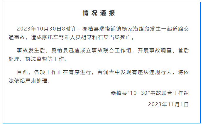 通报称,2023年10月30日8时许,桑植县瑞塔铺镇杨家洛路段发生一起道路交通事故,造成摩托车驾乘人员胡某和石某当场死亡。事故发生后,桑植县迅速成立事故联合工作组,开展事故调查、善后处理、执法监督等工作。目前,各项工作正在有序进行。若调查中发现有违法违规行为,将依法依纪严肃处理。