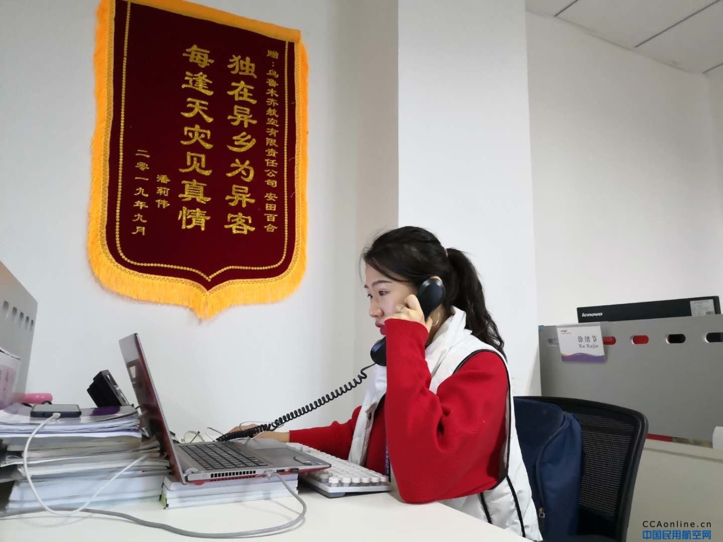 2019年8月11日,杭州地区受台风“利奇马”影响,导致航班大面积延误、高铁站全部关闭。身在杭州的潘女士无法前往郑州乘坐乌鲁木齐航空的班机,被迫带着老人和孩子滞留杭州机场。由于孩子年纪尚小,老人因身体缘故无法适应机场环境,该旅客选择向乌鲁木齐航空寻求帮助。安田百合接到求助电话后,立即为旅客提供解决方式,反复提醒旅客要随时与她保持联系,耐心等待后续的通知。接着,安田百合立刻沟通客服席商讨改签细则,并申请为该旅客的特殊情况提供保障。在安田百合的多方协调下,潘女士一家人的就餐和住宿问题最终顺利得到解决。